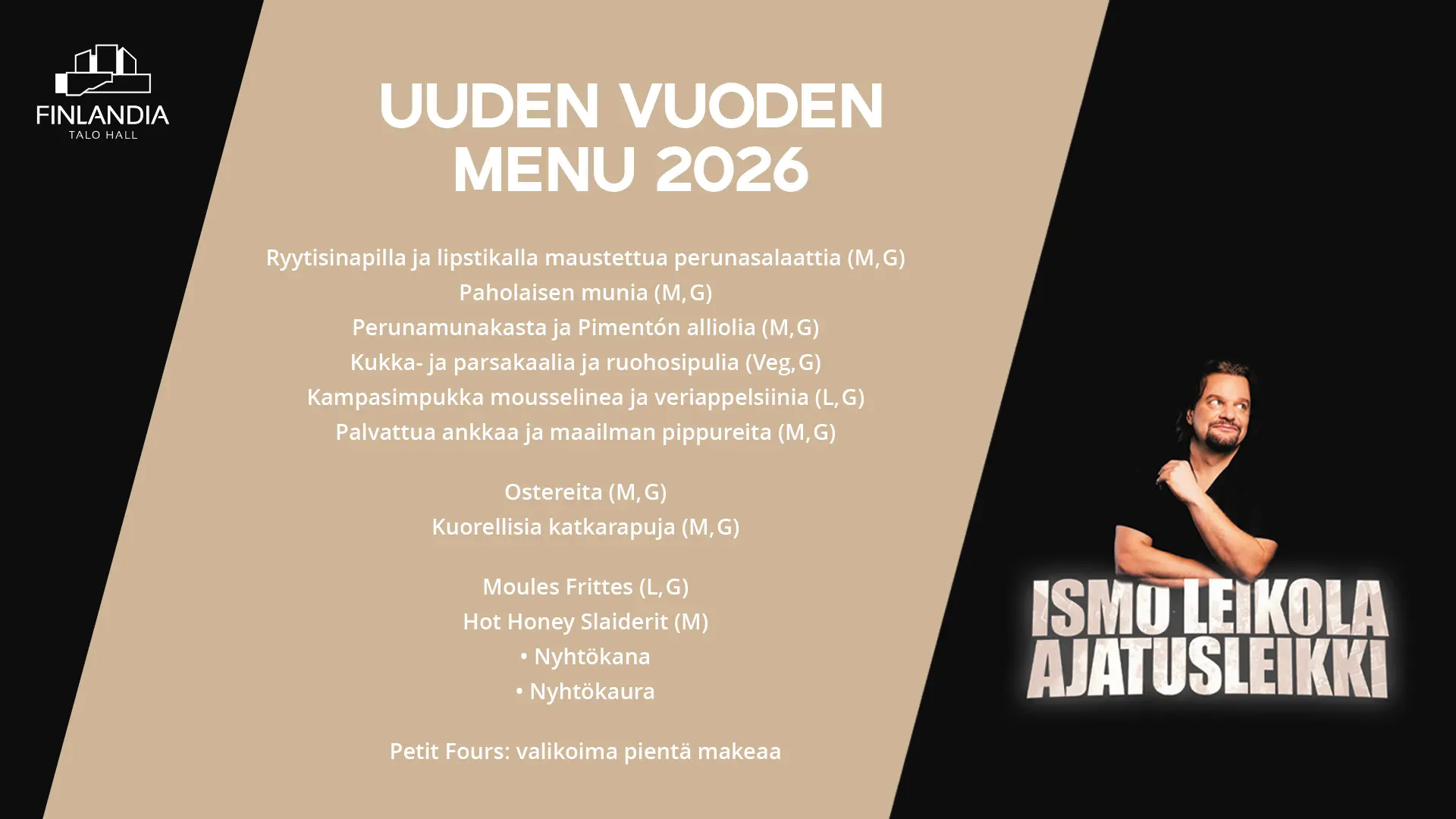 Vietä unohtumaton vuoden viimeinen ilta kanssamme. Jo kaksi tuntia ennen illan huikeaa show’ta virittäydymme juhlatunnelmaan Finlandia-talon keittiön taidokkaasti loihtiman Pre-Show Buffetin äärellä – aitoja makuja ja suussa sulavia herkkuja, jotka hivelevät makunystyröitä.