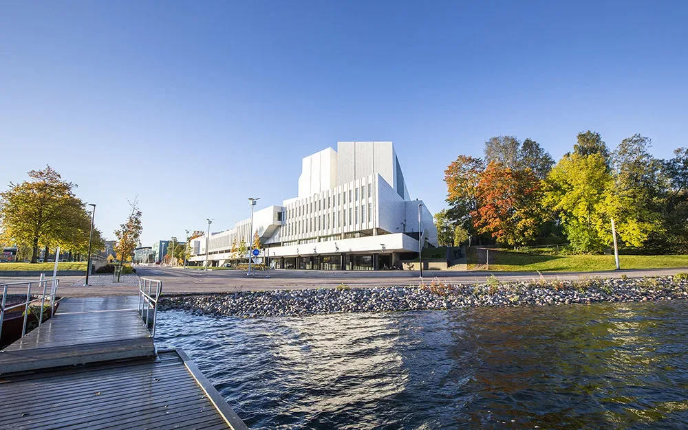 Den vita marmor som används i fasaden och inredningen hänvisar till Medelhavsländernas kultur, som var en inspirationskälla för Aalto. Marmor ger en kontrast till den svarta graniten. Den medelhavsinspirerade påverkan syns också i namnet piazza för konsertsalens foajé. Inomhusmiljön som imiterar utomhusmiljöer öppnar sig mot Tölöviken genom stora fönster.